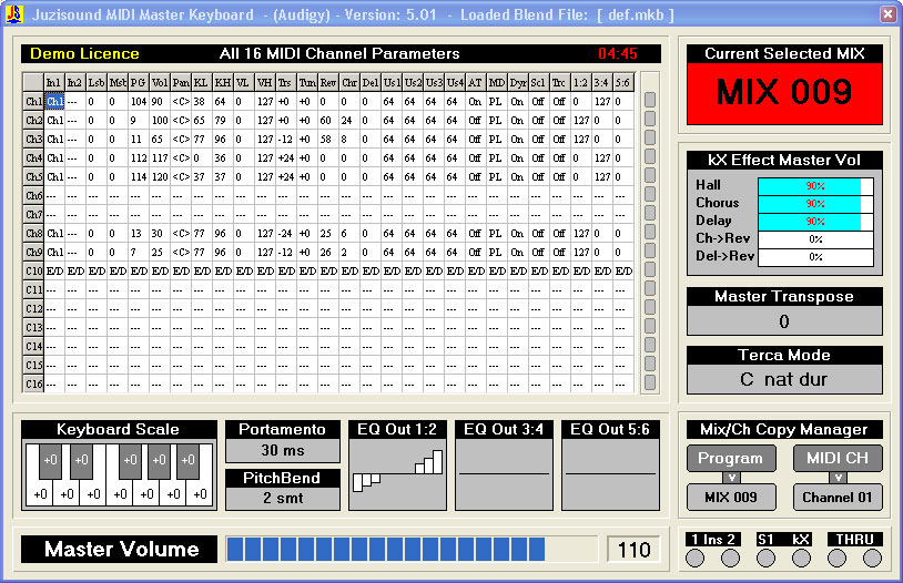 “Juzisound MIDI Master Keyboard” е компютърна програма, предназначена спецялно за пълноценна работа с карти на Creative, които имат чип EMU 10k или подобен. Такива карти са SB Live, SB Live 5.1, SB Audigy, SB Audigy 2 и др. Важно е да се отбележи, че за работа с тези карти не се използват оригиналните драйвери на Creative, а се използва така наречения kX драйвер. При желание да работите с тази карта, такъв kX драйвер ще ви бъде предоставен от "Juzisound". Важно е да знаете, че дори да си го намерите сами, то той отново трябва да бъде модифициран и то само от "Juzisound", за да бъде пригоден спецялно за работа с "Juzisouund" MIDI Master Keyboard. Най-подходяща като съотношение цена/възможности от изброените преди малко звукови карти е модела SB Audigy. При работа с нея и с "Juzisouund" MIDI Master Keyboard, Вие ще имате следните възможности: Свирене с до 16 бленди едновременно, делене на клавиатурата на 16 или повече отделни зони, като делението може да става едновременно според височината и според силата на натискане на определен тон. Избор на банка и бленда, избор на сила, панорама, транспониране, настройване, Reverb, Chorus, Delay, дозиране на всяка бленда по колко да отива към всеки един от наличните 3 стерео изхода, както и още много други параметри за всеки един отделен MIDI канал. Освен това ще имате и достъп до управление на 3 отделни 10 канални еквилайзери, по един за всеки от трите стерео изхода, както и управление на типа и параметрите на Reverb, Chorus и Delay ефектите, които предоставя картата. Всички тези параметри могат да бъдат запомняни и променяни, и по време на свирене, без да се налага да спирате. За запис на параметрите, програмата разполага с 127 бленди или по-точно микса, които могат да се извикват чрез Program Change съобщение от управляващата клавиатура - при това съвсем просто - само с едно натискане. Наборът от такива 127 бленди, може да се записва и зарежда от файл, като така броя на запомнените от Вас миксове е неограничен. Освен всичко това, програмата разполага с 2 основни MIDI входа, като информацията постъпваща на тях може да се смесва. Това позволява да се работи с 2 клавиатури едновременно. Освен тези 2 основни MIDI входа, програмата има и трети MIDI вход и MIDI изход, между които може да се включи или не MIDI Thru. Това позволява втория синтезатор на картата /тази карта е 32 канална/ да се използва за нещо друго - примерно GM модул, като това става независимо от първия с който Вие свирите. Освен всичко изброено до тук разполагате още с възможности за лесно и бързо превключване към GM режим за първия синтезатор, възможност за изолиране от миксовете само на 10-ти MIDI канал, който да се ползва за едновременна и независима от смяната на миксовете работа с външна Drums машина, както също и с вграден вътре в програмата MIDI анализатор, чрез който можете да наблюдавате всички входни и изходни MIDI сигнали постъпващи и излизащи от нея. Ако и това е малко, ще добавя, че имате много удобно направено MASTER усилване за всичките 3 стерео изхода едновременно, както и възможност сами да си определите до 4 допълнителни User контроли изпращани към синтезатора, с чиято помощ дори по време на свирене да можете да променяте още параметри на блендите. От версия 5.00 е добавена възможност за софтуерно емулиране на няколко режима на работа на всеки миди канал: полифоничен, моно с ретригер, моно с легато и моно с най-доброто възможно портаменто. Тези режими се избират независимо за всеки отделен миди канал